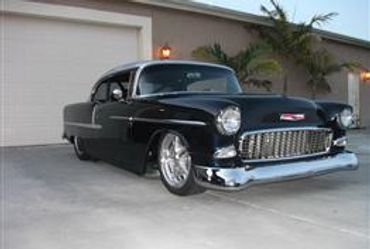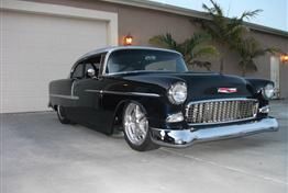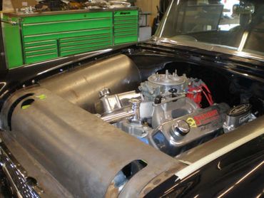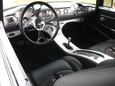 We completely built this 1955 Chevy from the frame up. The customer contacted us about doing the interior on this car so we went to the painter to look at it. The car was basically just a body on a chassis. He told us that several shops had worked on the car and had done a lot of metal fab and installed a roll bar. The front and rear suspension was on the car so it could roll but that was about it. He explained he didn't have a shop to build the car and asked if we were interested. We have done similar projects in the past but I wasn't sure I wanted to tackle another. After calling us everyday for a couple weeks we finally agreed to build the car for him. The body was on an Art Morrison chassis and the work done so far was top notch. We built this car with a Shafiroff 582 big block mated to a six speed transmission. We fabricated all the under hood sheet metal and pretty much put every nut and bolt on this car. We added a full Ride Tech air system front and rear. We also installed power windows, A/C and a full stereo system. The list goes on and on. We made the forward tilt hood and fabricated the sheet metal under the hood and of course a full custom interior.