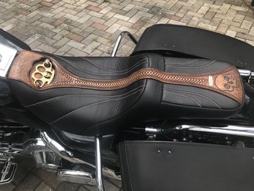 Each hand tooled seat is individually designed for each client. Every seat starts with a hand drawn design which is then transferred onto vegetable tan leather then it is painstakingly hand tooled into the leather. When the design is finished the leather is then hand dyed to the desired color and sealed.